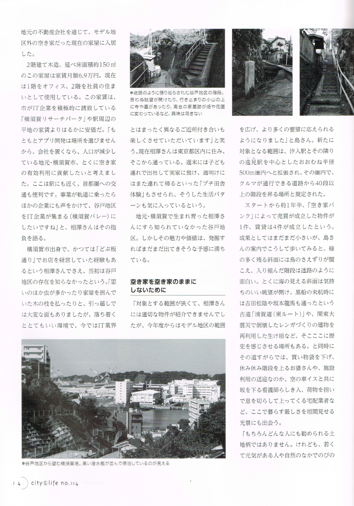 ホームメディア掲載 「city&life」の特集「空き家 家と暮らしと地域のこれから」にて、当社の横須賀での活動が紹介されました。 2015年10月19日2015年10月20日 2015年10月「city&life」の特集「空き家 家と暮らしと地域のこれから」にて、当社の横須賀での活動が紹介されました。 [2015年10月 city&life]