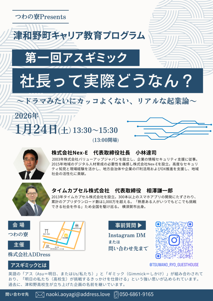 当社代表、相澤 謙一郎が津和野町キャリア教育プログラム「第一回アスギミック 社長って実際どうなん?」に登壇します。