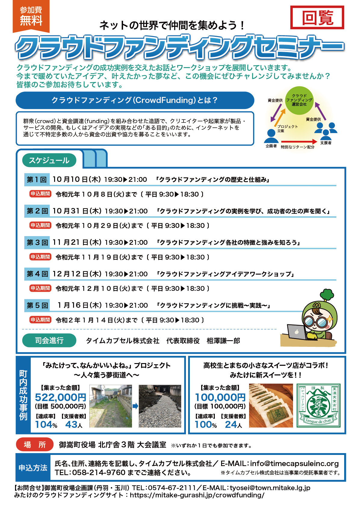 タイムカプセル株式会社(所在地:岐阜県岐阜市、代表:相澤謙一郎、以下タイムカプセル)は、御嵩町が主催する「クラウドファンディングセミナー」にて講師を担当いたします。