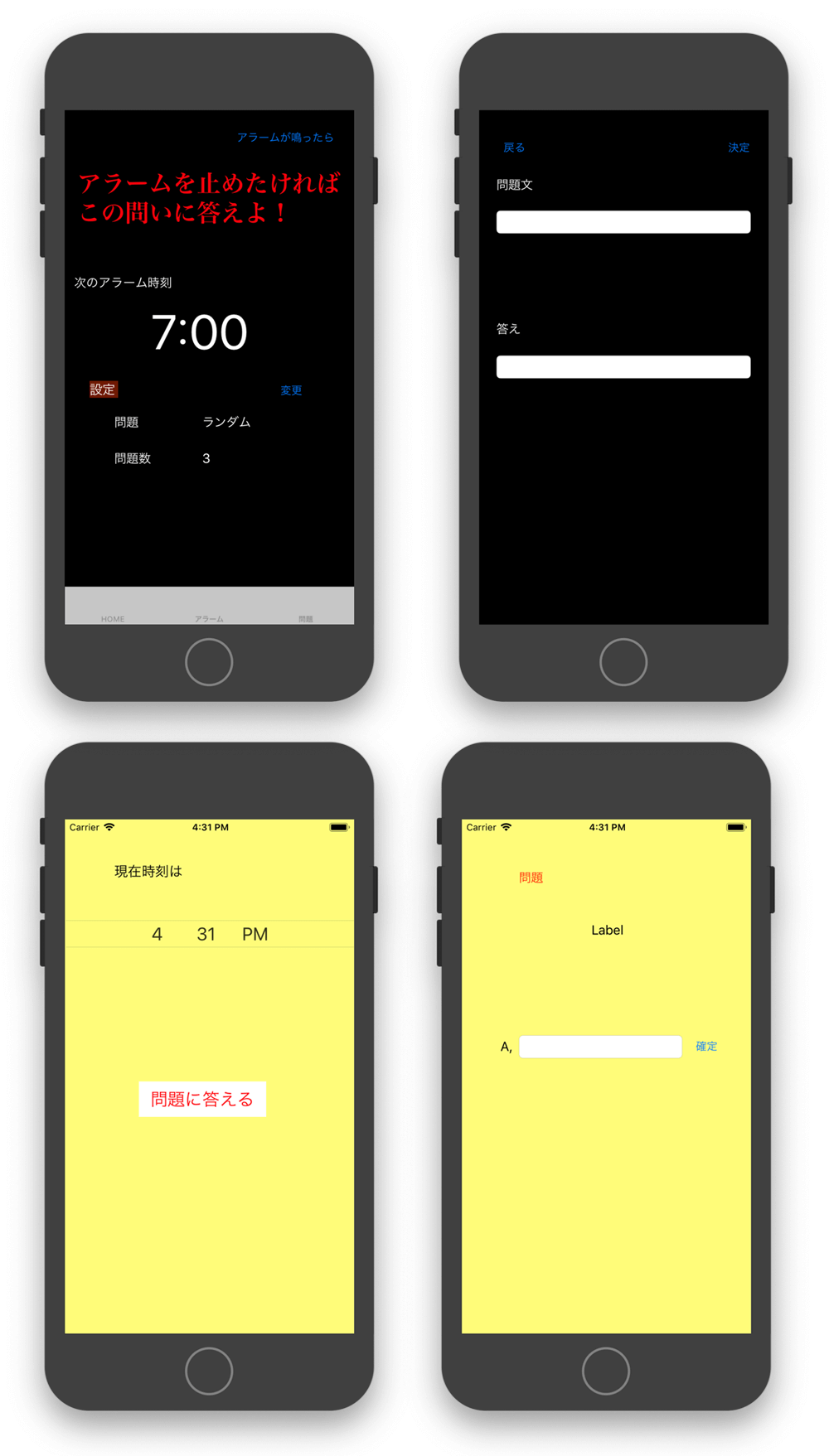 ・目覚まし時計アプリ。アラームを止める時にクイズに答えます。そのクイズはあらかじめ自分で考えたものを出題。1日をクイズで始めることで勉強への切り替えができます。