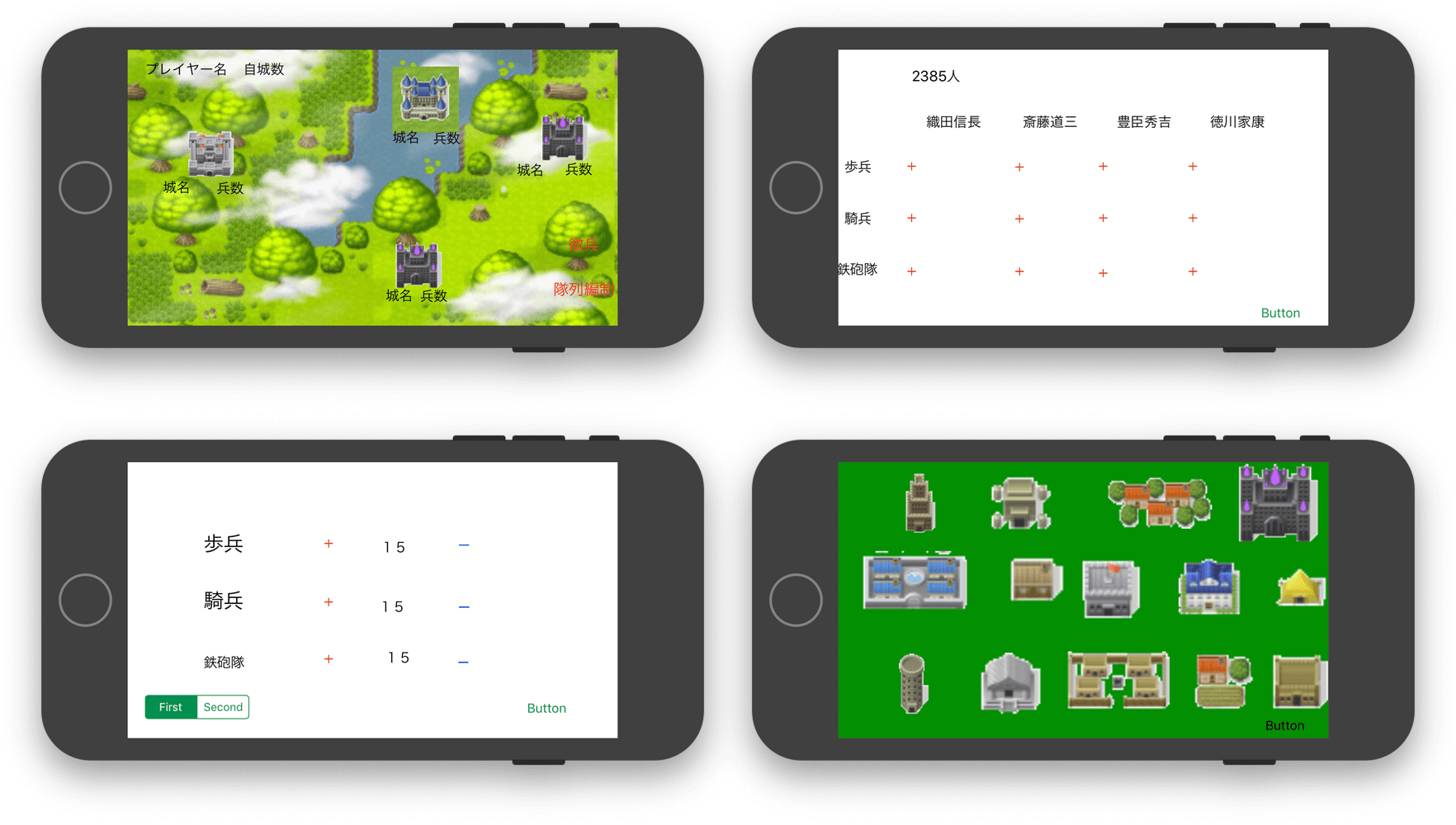 天下統一を目指すゲームです。城下町を建設して反映させたり、兵や武将を配置してその兵で攻めるゲームです。