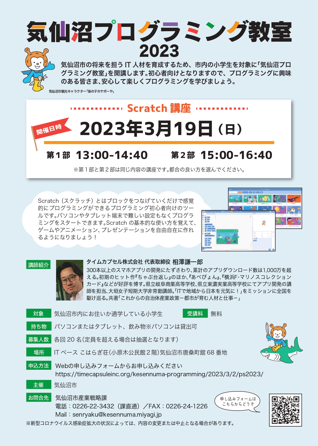 気仙沼市主催の【気仙沼プログラミング教室2023】において、タイムカプセル株式会社(本社:岐阜県岐阜市、代表:相澤謙一郎、以下タイムカプセル)は、運営を担当いたします。